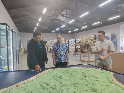 2024年10月17日,驻瑙鲁大使吕进携馆员参观瑙鲁博物馆,瑙博物馆馆长库克陪同介绍。