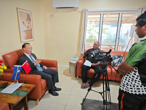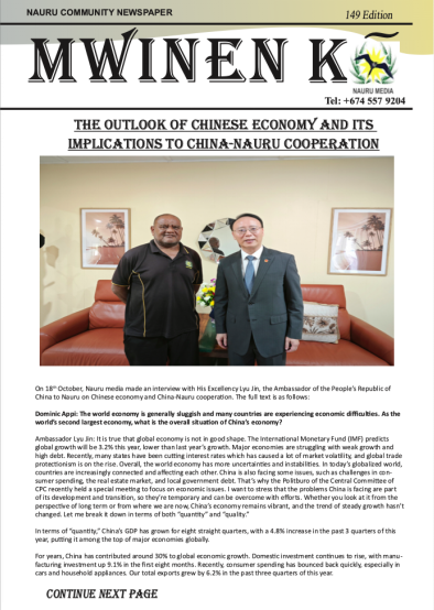 2024年10月18日,驻瑙鲁大使吕进接受瑙主流中英媒体《瑙鲁周报》主编多米尼克·阿皮专访,重点介绍近期中央政治局会议精神、中国经济形势和中瑙关系发展情况。访谈内容在《瑙鲁周报》第149期头版头条刊登,全文如下: