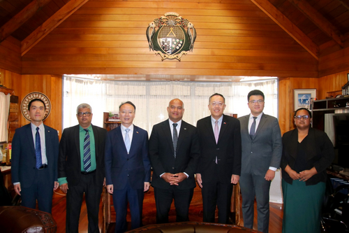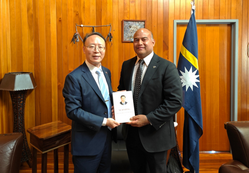 2025年10月23日,驻瑙鲁大使吕进拜会刚刚当选连任的瑙鲁总统阿迪昂,向其赠送《习近平谈治国理政》第五卷。