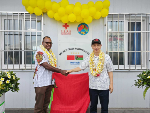 2025年11月21日,驻瓦努阿图大使李名刚访问塔纳岛,出席驻瓦使馆向塔菲亚学校捐赠太阳能电子教室移交仪式。瓦内政部长纳珀特、塔菲亚省长伊瓦卡、省政府代表、塔菲亚学校师生近百人出席。