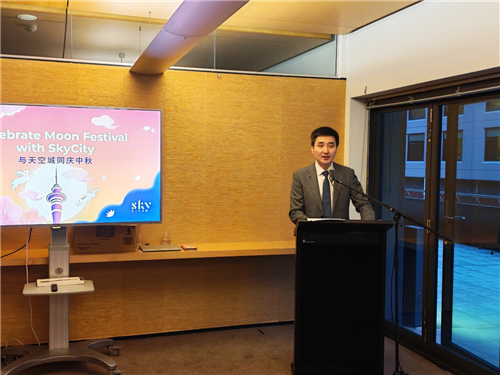 2025年10月3日,驻奥克兰代总领事王俊超出席奥克兰天空塔中秋投影启动仪式。新西兰中国商会主席胡北海、天空城文旅事业部总经理阿洛特及当地机构、媒体代表等近百人出席活动。