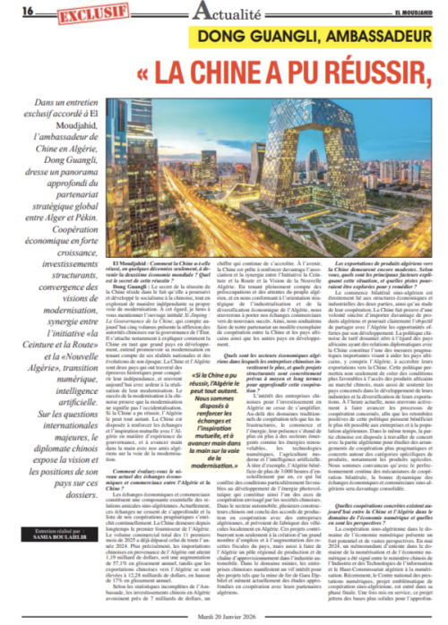 2026年1月15日,驻阿尔及利亚大使董广利接受阿法文官方媒体《圣战者报》采访,重点解读《习近平谈治国理政》第五卷核心思想和重要意义,详细阐释台湾问题来龙去脉、零关税政策对非利好、全球治理倡议、世界人工智能合作组织,介绍中阿经贸务实合作和人文交流成果,并就相关国家涉台错误行径等问题阐明中方严正立场。采访于2026年1月20日在该报刊发,实录如下:
