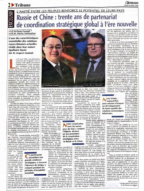2026年4月23日,驻阿尔及利亚大使董广利与俄罗斯驻阿尔及利亚大使索洛马京在阿法文媒体《表达报》和阿发行量最大的阿文媒体《消息报》发表题为《以民心之亲,促国家之兴——中俄新时代全面战略协作伙伴关系三十载》的联合署名文章,全面阐释中俄关系深刻内涵。全文如下:
