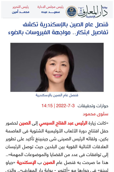 近日,驻亚历山大总领事赵丽莹接受埃及十月杂志及《知识门户》新闻网站书面采访,就中国疫情防控、经济发展、中埃合作最新情况等问题回答了记者提问,全文如下:
