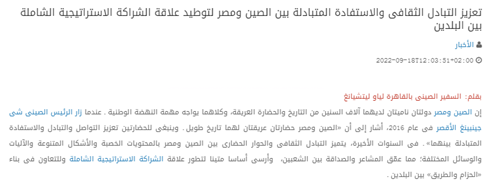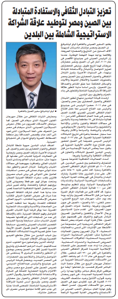 为迎接党的二十大胜利召开,驻埃及大使廖力强在埃及官方媒体《消息报》发表系列署名文章,结合新时代中国各领域发展成就和中埃友好合作成果,深入宣介习近平新时代中国特色社会主义思想,特别是习近平外交思想。2022年9月18日,系列署名文章第三篇《加强文化交流互鉴 夯实中埃全面战略伙伴关系民心基石》在《消息报》及其网站同时刊发。全文如下:
