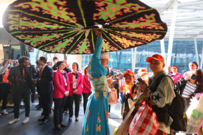 当中国旅行团出现在机场抵达大厅时,身着古埃及传统民族服饰的埃及青年夹道欢迎,埃及艺术家跳起经典的旋转舞,加达副部长、叶海亚董事长、纳希尔总书记等埃方各界人士同廖力强大使一起上前热情相迎,为中国旅客送上鲜花、纸草画、铜盘等埃及特色纪念品以及兔子造型的玻璃工艺品和巧克力。欢迎人群两侧拉起“中国朋友,埃及等你来!”字样的中阿双语横幅,充分展现了埃及人民对中国朋友的友好之情。