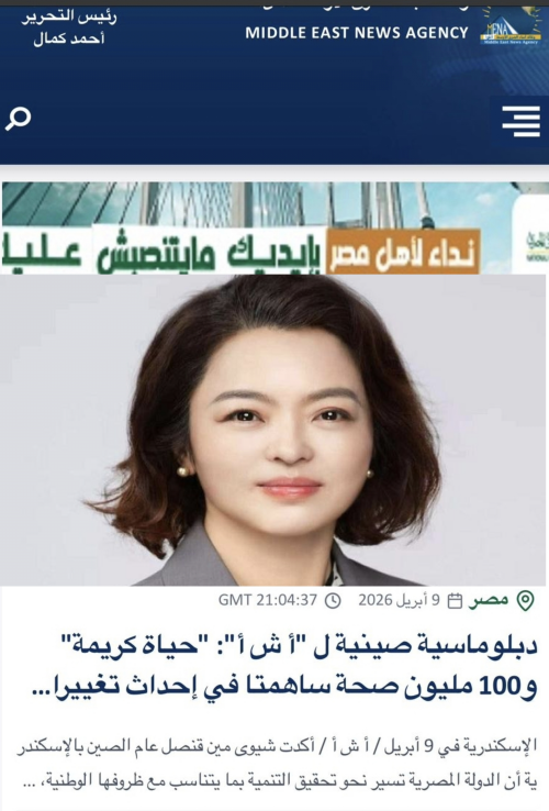 2026年4月9日,驻亚历山大总领事徐敏在当地主流媒体中东通讯社发表署名文章《携手同行,为世界和平、发展与安全注入正能量》,宣介全国“两会”与“十五五”规划。《祖国报》《鲁兹·尤素福》《埃及人》等多家媒体转载刊登,全文如下:
