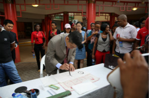 整场活动在热烈、欢快的气氛中进行。学生们观看了介绍中国和中博关系的电视宣传片。使馆外交官和家属们纷纷登台献艺,表演了书法、古筝、太极剑、扇子舞等中国传统文艺。孔子学院的老师也为学生们献上了剪纸、功夫等独具中国特色的节目。大家对中华文化赞不绝口,表现出浓厚的兴趣,不少学生现场学习起书法、剪纸来。