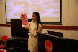 | 李南参赞展示书法 | 孔子学院老师展示剪纸 |