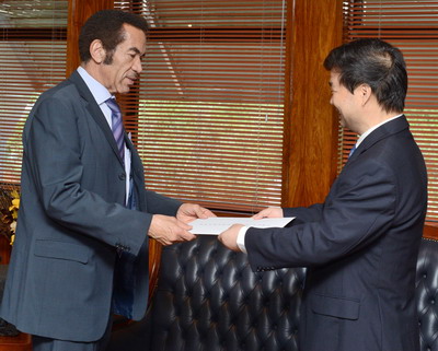 2016年11月29日,新任驻博茨瓦纳大使赵彦博在博总统府向博总统卡马递交国书。博国际事务与合作部长文松等出席仪式。递交国书后,赵大使与卡马总统就中博关系进行了友好、深入、坦诚的交谈。