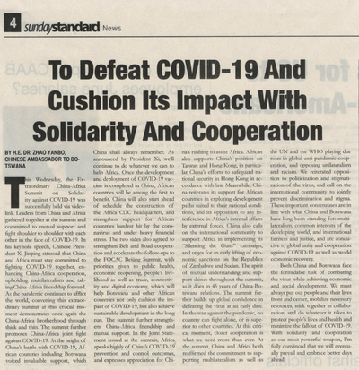 2020年6月21日,驻博茨瓦纳大使赵彦博就中非团结抗疫特别峰会在当地主流媒体《星期日标准报》发表题为《团结合作战胜新冠病毒,齐心协力降低疫情影响》的署名文章,全文如下: