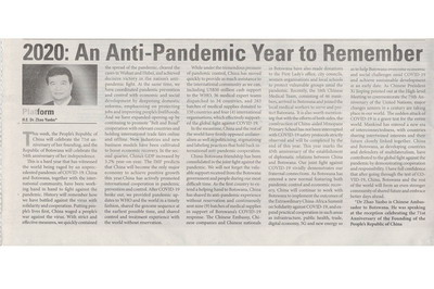 2020年10月2日,驻博茨瓦纳大使赵彦博就庆祝中华人民共和国成立71周年在当地主流媒体《博茨瓦纳卫报》发表题为《2020年:值得铭记的抗疫之年》的署名文章。全文如下: