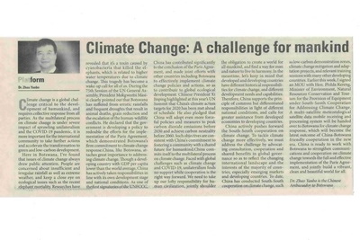 2020年11月12日,驻博茨瓦纳大使赵彦博就中博合作应对气候变化在当地主流报纸《卫报》发表题为《气候变化是全人类的共同挑战》的署名文章。全文如下: