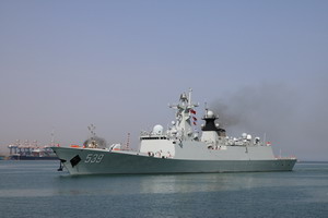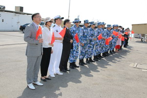 2018年9月9日,驻吉布提大使卓瑞生偕使馆外交官和我驻吉保障基地官兵代表赴吉布提港迎接中国海军第30批亚丁湾护航编队主力舰芜湖舰(舷号539)来吉布提休整补给。