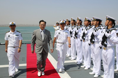 卓大使登舰检阅仪仗队,并与护航编队指挥员等编队领导和芜湖舰官兵座谈。卓大使指出,我人民海军护航行动对于维护亚丁湾、索马里海域国际航道安全,乃至地区和平稳定都具有重要意义,向我护航将士不畏艰险、连续奋战的精神表达敬意和感谢,表示使馆将一如既往全力做好有关服务保障工作。