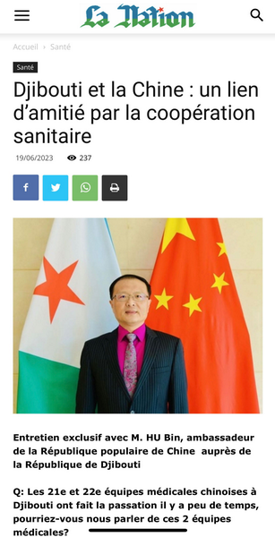 2023年6月19日,吉布提主要官方报纸《民族报》刊登对驻吉布提大使胡斌的“中国和吉布提:卫生健康领域的紧密合作”主题专访。胡大使详细介绍了中吉医疗卫生合作新成果和新亮点、中国派遣援外医疗队60周年重要意义等,全文如下: