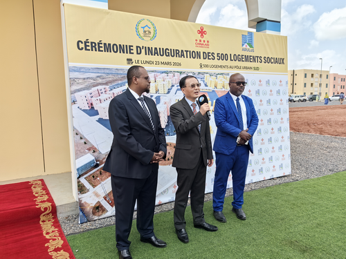 2026年3月23日,驻吉布提大使胡斌陪同吉总统盖莱出席由中方援建的500套社会保障房项目揭幕仪式并现场接受媒体采访,吉总理、议长、城建部长及其他政要等参加活动。