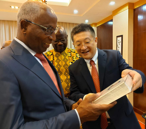 招待会现场气氛热烈,孙大使向乌里总理赠送《习近平谈治国理政》第五卷,来宾们盛赞中国式现代化发展成就,畅叙中几合作美好未来。