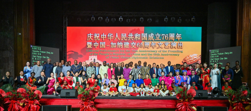 2025年9月26日,驻加纳使馆隆重举办庆祝中华人民共和国成立76周年暨中加建交65周年招待会和文艺演出。驻加纳大使童德发、加纳副总统奥波库-阿杰曼分别致辞,多位省部级官员和各界友人、驻加使节、华侨华人、企业代表等约1200人出席。