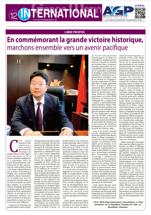 2025年9月8日,驻加蓬大使周平在加蓬最大报纸《加蓬晨报》发表题为《铭记伟大历史胜利,共同迈向和平未来》的署名文章,纪念中国人民抗日战争暨世界反法西斯战争胜利80周年,宣介习近平主席提出的全球治理倡议,阐明中方在台湾问题上的原则立场。