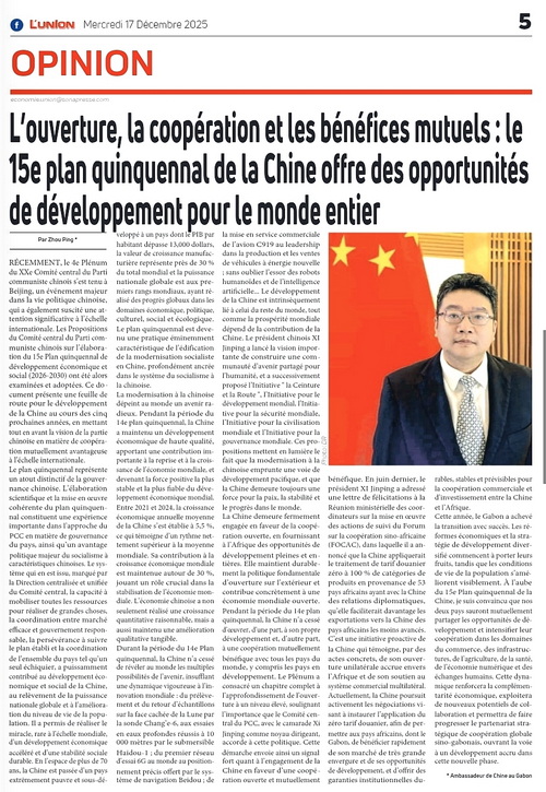2025年12月17日,驻加蓬大使周平在加蓬发行量最大报纸《团结报》整版发表题为《开放合作、互利共赢:中国“十五五”规划为世界带来发展机遇》的署名文章,宣介党的二十届四中全会精神: