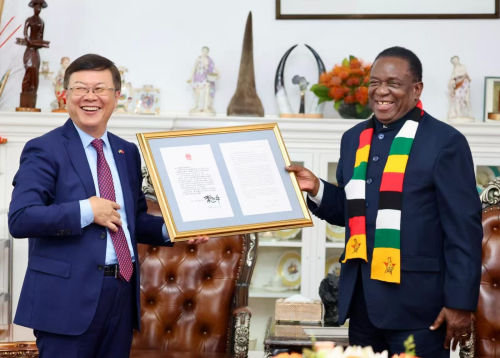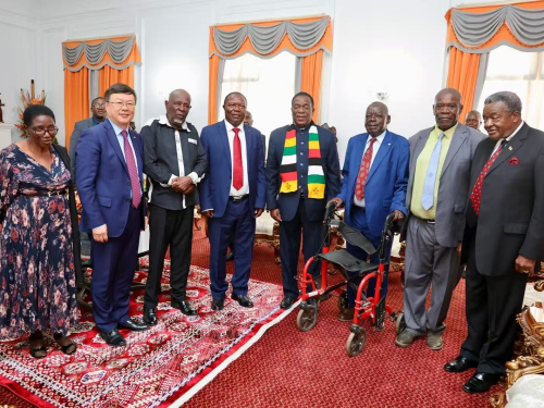 2026年2月26日,驻津巴布韦大使周鼎向津总统姆南加古瓦转交习近平主席致津解放斗争老战士复信。津代理外长恩德洛武,解放斗争退役军人部长马温加,津议会外委会主席、津中友好协会主席沙穆及老战士代表出席。