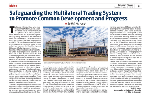 2025年10月2日,驻喀麦隆大使徐永在喀主流媒体《论坛报》发表题为《维护多边贸易体制 促进共同发展进步》的署名文章,详细阐释中国在世贸组织当前和未来谈判中将不寻求新的特殊和差别待遇的重要立场,指出相关宣示表态彰显中国对多边贸易体制的坚定支持和大国担当,强调中国发展中国家的地位和身份没有改变,始终是全球南方一员,将一如既往维护多边贸易体制,坚定捍卫发展中国家正当权益,推动全球治理体系朝着更加公正合理的方向发展,携手各国共同为建设开放型世界经济作出积极贡献。