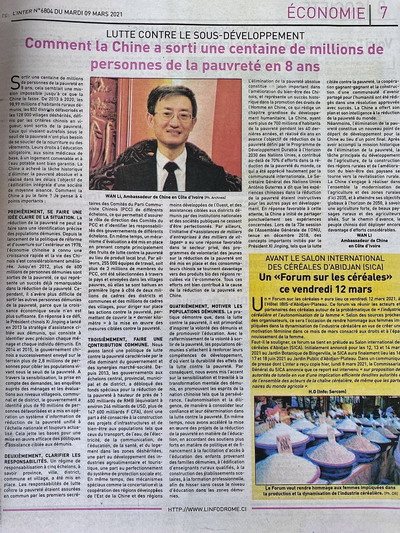 2021年3月9日,科特迪瓦最大独立报纸《国际报》刊登驻科特迪瓦大使万黎署名文章《中国如何在8年内让近亿人脱贫?》,全文如下: