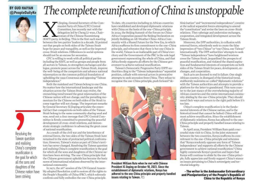 2026年4月23日,驻肯尼亚大使郭海燕在肯尼亚《人民报》以及《星报》和首都新闻调频网站发表题为《中国实现完全统一势不可挡》的署名文章。全文如下: