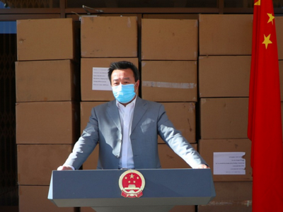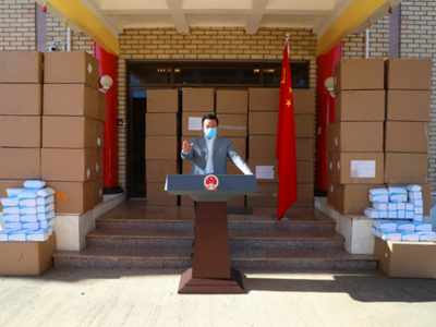 2020年8月11日,驻莱索托大使雷克中在使馆向在莱中国公民发放抗疫物资,在莱侨团、中资企业商会及领保志愿者代表在使馆接收了物资。