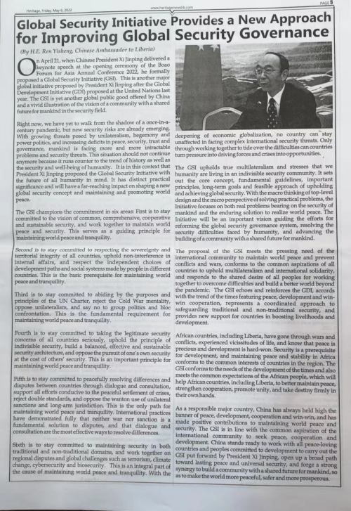 近日,驻利比里亚大使任义生在利主流媒体发表题为《全球安全倡议为进一步完善全球安全治理提供新思路》的署名文章,详细阐述了习近平主席提出的全球安全倡议的核心内容,指出这是中方提供的又一国际公共产品,为进一步完善全球安全治理提供了新思路,是人类命运共同体理念在安全领域的生动实践。利《非洲首页报》、《每日观察家报》、《新民主人报》、《新闻报》、《传统报》、《问询者报》、《分析家报》、《热辣报》、《妇女之声报》等主流媒体进行了全文刊登。 全文如下: