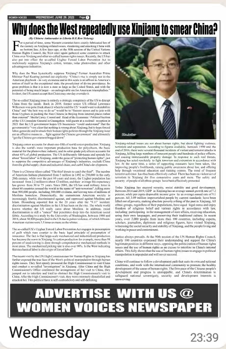 近日,驻利比里亚大使任义生在利主流媒体发表题为《为什么美西方一再利用新疆抹黑中国?》的署名文章,揭批美西方一再利用新疆问题破坏中国稳定、遏制中国发展的险恶用心,介绍新疆问题的实质以及新疆发展成就,表示公道自在人心,美西方借人权问题大搞政治操弄绝不会得逞。利《每日观察家报》、《传统报》、《调查者报》、《分析家报》、《妇女之声报》等主流媒体进行了全文刊登。全文如下: