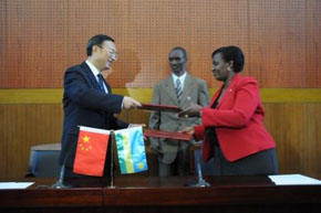 | 杨外长与卢外长出席签字仪式 | 杨外长为中国驻卢旺达使馆新馆剪彩 |
