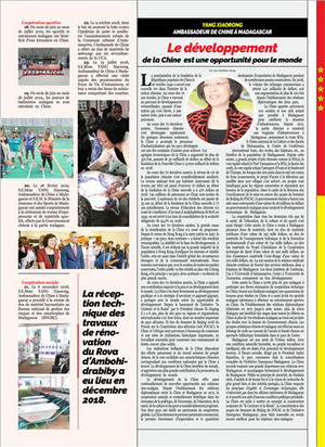 2019年10月1日新中国成立70周年当天,驻马达加斯加大使杨小茸在马主流媒体《午报》、《快报》、《新闻报》、《Taratra》(马语)、《Gazetiko》(马语)发表署名文章《中国的发展是世界的机遇》。全文如下: