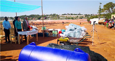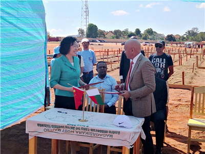 2019年11月19日,驻马达加斯加大使杨小茸同马环境和可持续发展部长亚历山大·若尔热共同出席使馆向马方捐赠植树育苗物资交接仪式。