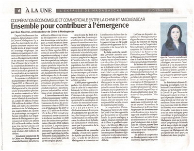 2021年3月4日,驻马达加斯加大使郭晓梅在马主流媒体《快报》发表署名文章《中马经贸合作:携手同心共进,助推振兴发展》。全文如下: