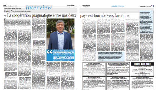 近日,驻毛里求斯大使朱立英接受毛主流媒体《毛里求斯人报》专访,就台湾问题等回答记者提问。