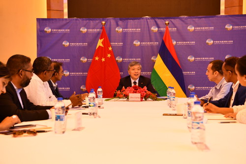 朱立英大使首先重点宣介当前中国发展、中毛关系和即将召开的党的二十大。朱大使表示,近十年来中国经济总量占世界比重从11.3%上升到18%,人均国内生产总值翻了一番,达到12000美元。2013年至2021年,中国国内生产总值年均增长6.6%,对世界经济增长的平均贡献率超过30%。中国坚持共享原则,发展成果惠及全体中国人民,脱贫攻坚战已经取得全面胜利,通过8年持续奋斗使近1亿贫困人口脱贫,现在拥有全球规模最大超4亿人的中等收入群体。中国多年稳居世界第一大贸易国地位,发展成果惠及世界其他各国人民。中国欢迎包括毛里求斯在内的世界其他各国继续搭乘中国发展快车,共享发展机遇和成果。
