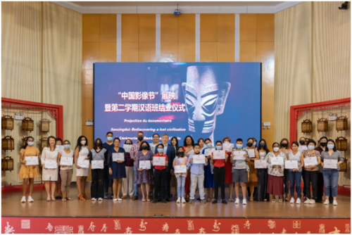 活动现场播放了二位汉语教师从中国为学员送来的视频祝福。汉语班学员献上了精彩纷呈的诗朗诵、舞蹈、合唱等文艺演出。结业典礼最后,朱立英大使、古拉司长为学员们颁发了结业证书并一起观看了“中国影像节”展映记录片《三星堆:再现失落的文明》。