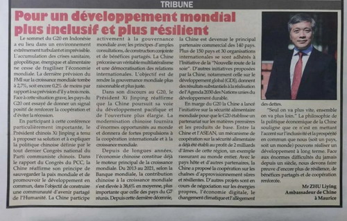 2022年11月21日,驻毛里求斯大使朱立英在毛主流媒体《挑战报》发表题为《推动更加包容、更有韧性的全球发展》的署名文章。文章结合宣介党的二十大精神,重点阐述习近平主席在二十国集团领导人峰会上提出的中国方案,指出中方一系列主张和倡议致力于促进各国团结合作,推动更加包容、更有韧性的全球发展。