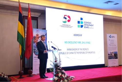 朱立英大使在致辞中指出,今年是中毛建交50周年,中毛两国关系始终保持高水平、全方位发展,各领域务实合作持续推进。中国目前已成为毛最大贸易伙伴国、最大进口来源国;2019年,两国签署了与非洲国家第一个自贸协定——中毛自贸协定;近年来双方深化了基础设施建设、金融和投资等领域合作,都取得了丰硕成果。朱大使代表中国大使馆对毛里求斯政府、毛工商协会及企业、中资企业等表示衷心感谢。
