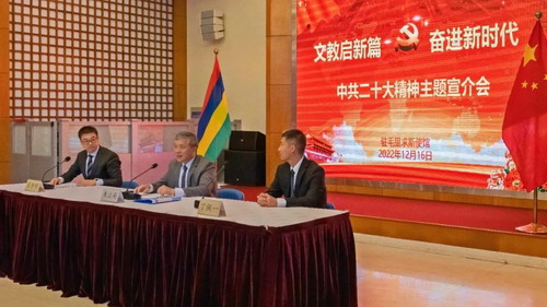 2022年12月16日,为深入学习、宣传、贯彻和落实党的二十大精神,全面贯彻习近平新时代中国特色社会主义思想,驻毛里求斯使馆举行“文教启新篇,奋进新征程”中共二十大主题宣介会。驻毛里求斯大使朱立英出席会议,来自中国文化中心、毛里求斯大学孔子学院、国际中文教师志愿者的28名工作人员和教师参加活动。