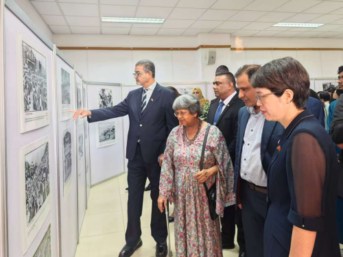 来宾参观抗战主题图片展并观看电影纪录片《里斯本丸沉没》,赞赏中国为促进世界和平发展做出的积极贡献。