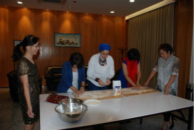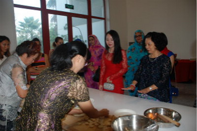 摄影展后,大使夫人又引导客人观看中国厨艺展示,并请客人实际操作包饺子。来宾们看见和好的饺子面以及各种备用饺子馅,不禁一阵雀跃欢呼。不少使团朋友早就有观摩中国美食现场秀的愿望,没想到今天夙愿得偿。来宾一边聚精会神地观看两位使馆女馆员包饺子,一边饶有兴趣地听武大使夫人介绍饺子的历史和制作工序。现场友人兴趣浓厚,踊跃报名,上场向中国师傅学习包饺子技艺。不一会儿功夫,一盘盘水饺即飘香出锅,几个毛塔朋友轻轻尝了一口,立刻竖起了大拇指,“真好吃!”、“这才是正宗的中国饺子!”。离开时,使馆还准备了中国美食、医药、茶道等方面的光盘、书籍,来宾惊喜地说“有吃还有拿呀!”。