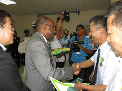 毛卫生部长卡内·布巴卡尔代表阿齐兹总统为中国援毛医疗队队长杨森及其他队员逐一授勋并颁发有总统亲笔签名证书,对医疗队全体队员在毛期间改善当地民众医疗条件、保障健康做出的重要贡献表达了感激之情。