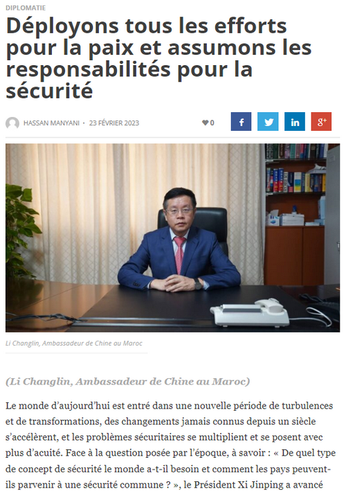 2023年2月23日,驻摩洛哥大使李昌林在摩主流媒体《挑战者周刊》发表题为《为和平尽力,为安全担当》的署名文章,全面介绍中方日前正式发布的《全球安全倡议概念文件》,阐述中国为世界和平安全担当尽责的积极意愿和实际行动。主要内容如下: