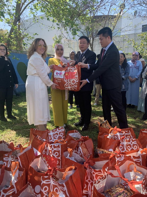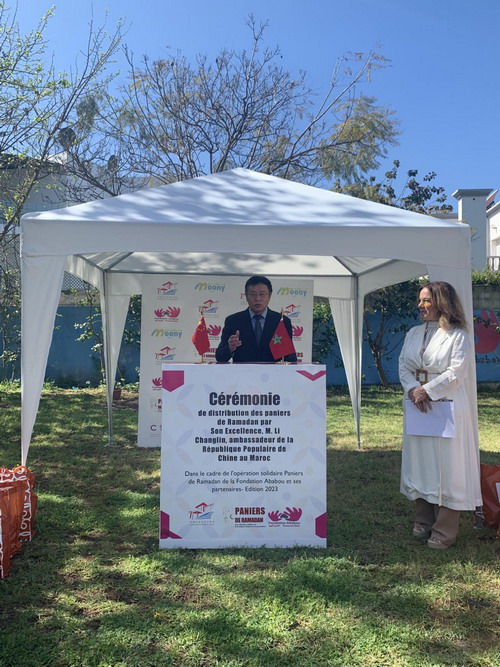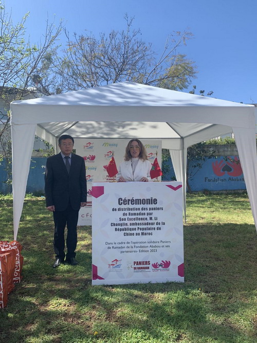 2023年3月31日,驻摩洛哥使馆同摩阿巴布基金会共同举办斋月捐赠物资发放仪式,驻摩洛哥大使李昌林、阿巴布基金会主席阿巴布、受捐家庭代表等出席。此次捐赠物资以米、油、糖、面粉、椰枣等食品为主,将分发给五百户当地困难家庭。