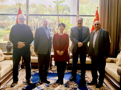 2025年12月25日,驻摩洛哥大使余劲松同摩中友好交流协会主席哈利勒、摩中文化和经济促进协会主席法塔维、摩各国人民友好协会主席阿玛里、“非洲精神奖”基金会主席贝勒哈亚特进行友好交流。