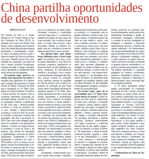 2025年11月17日,驻莫桑比克大使郑璇在莫桑比克《消息报》发表署名文章《“十五五”规划:中国与世界共享发展机遇》,宣介二十届四中全会精神,全文如下: