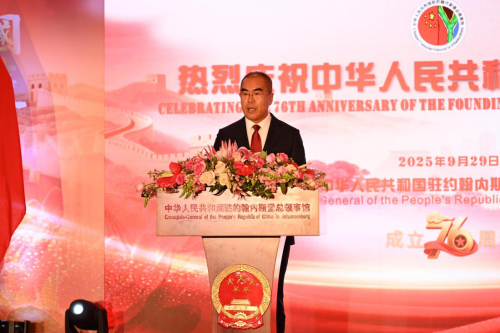 2025年9月29日,驻约翰内斯堡总领馆举办庆祝中华人民共和国成立76周年招待会。驻约翰内斯堡总领事潘庆江、南非豪登省和自由州省多名执委委员、政商学媒各界人士及中资机构、华侨华人代表近300人出席。